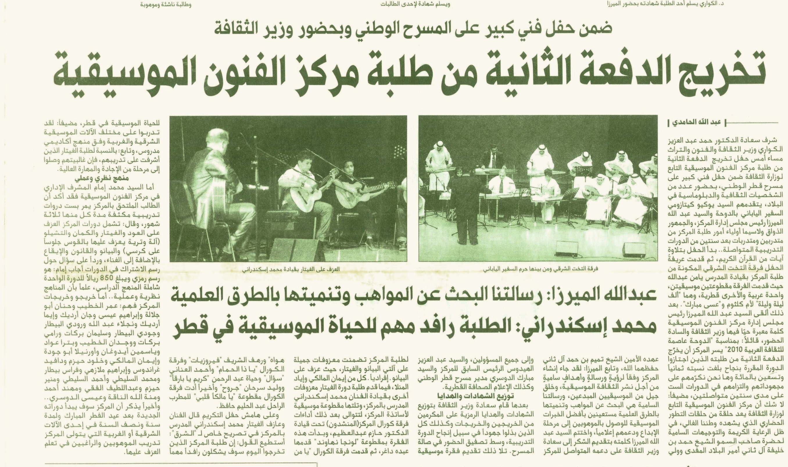Al Watan: coverage of a musical events by the student's of Art Music Center (affiliated by the ministry of culture). In a bold title; M. Iscandarani (AlexanderRani) : "The students are considered as a very important contribution to the musical life in Qatar".